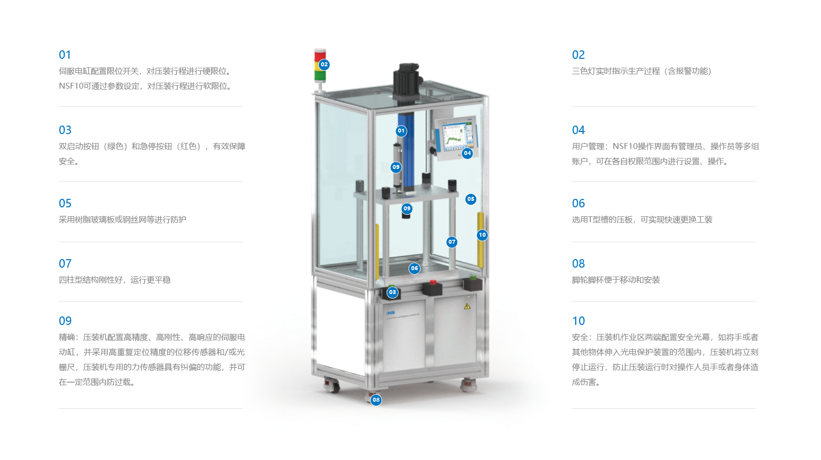 NSD21由伺服电缸、伺服电机、伺服驱动器、NSF10监测仪、力和位移传感器、结构件、框架等主要部件构 成。各部件之间采用模块化设计的理念,可方便地组配出客户所需的产品。